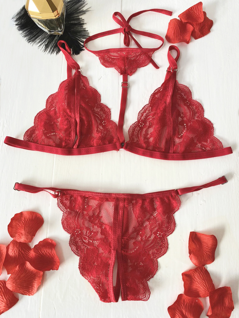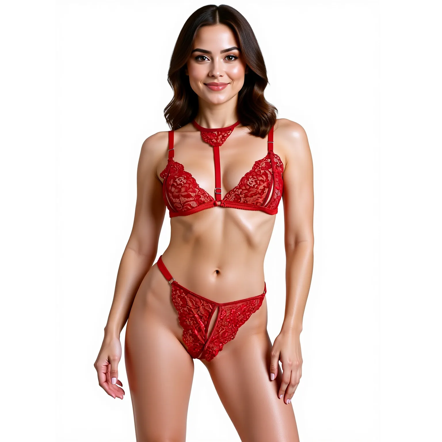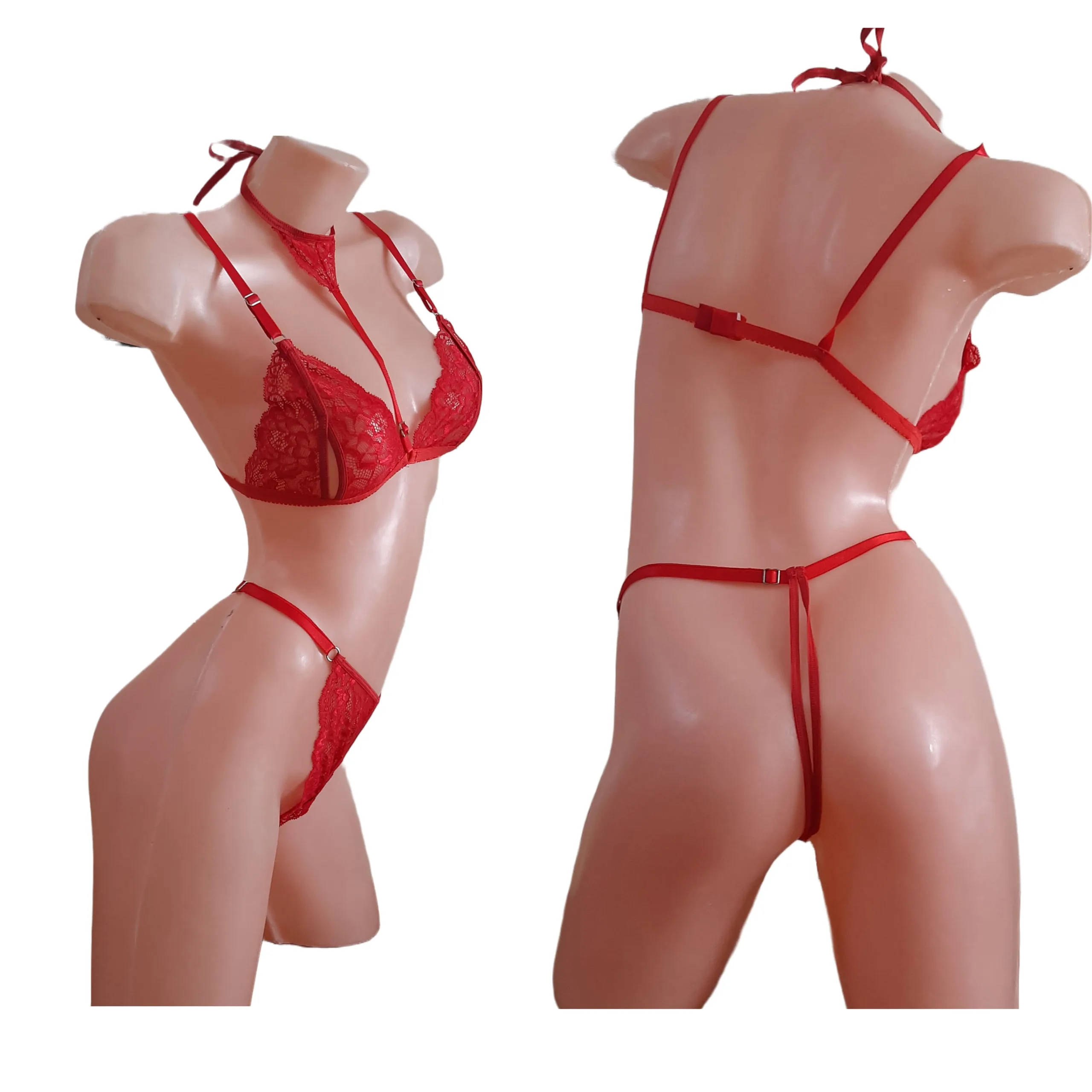 En puntilla con regulaciones – Con cuello, corpiño abierto y colaless abierta (rutera) disponible en talles del 85 al 120 y en colores Negro, Azul y Rojo.